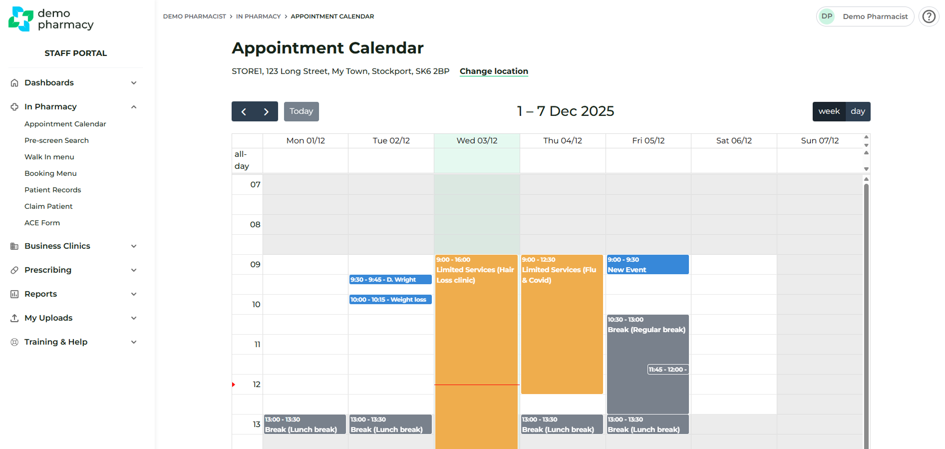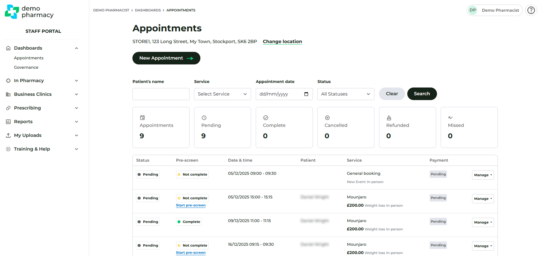 - Default View: By default, this screen displays a list of all upcoming appointments for your specific pharmacy branch (not just your personal bookings), ordered from soonest to furthest away.