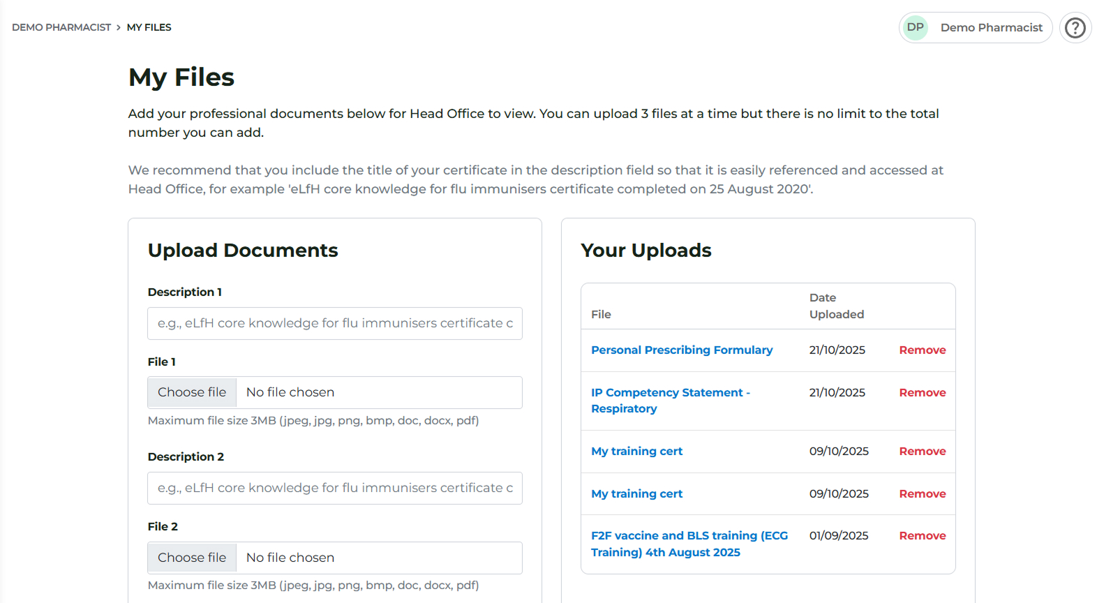 You can upload any relevant certificates to your profile by navigating to My Uploads > My Files in the side panel navigation.