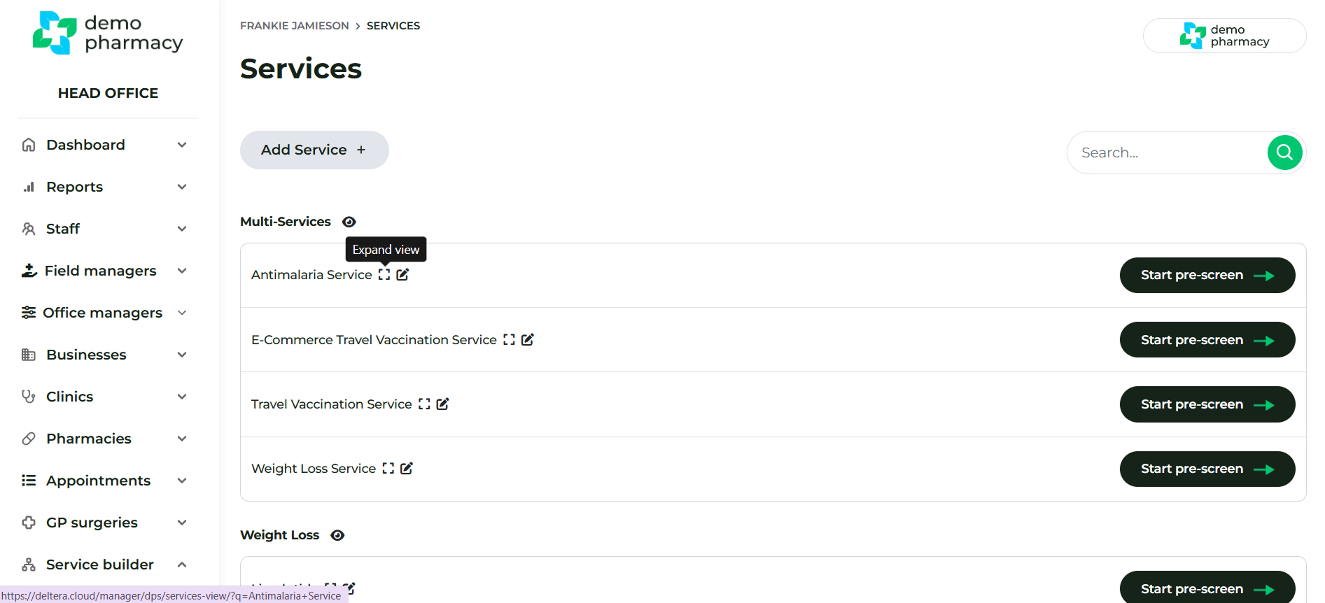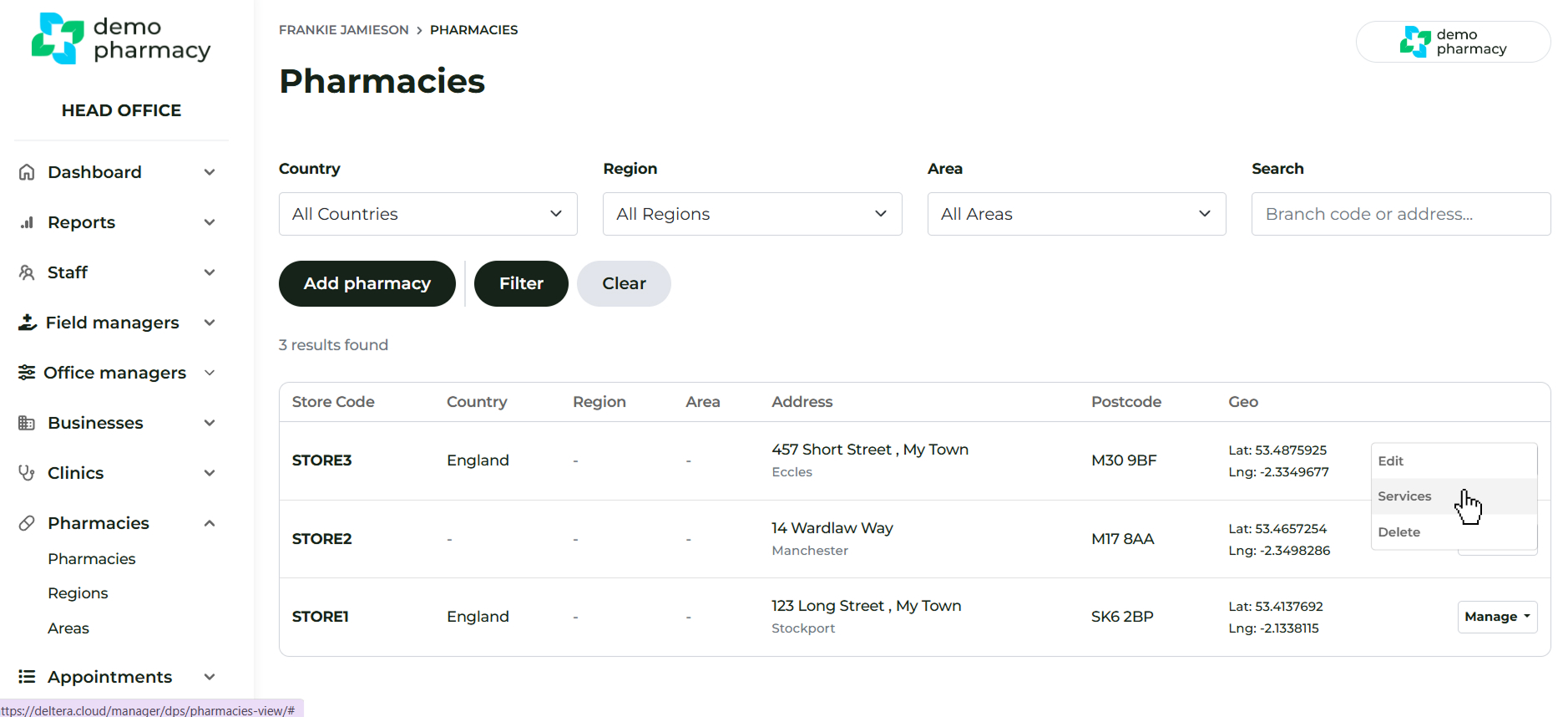 - Click ‘Manage’ next to the specific pharmacy you wish to configure.