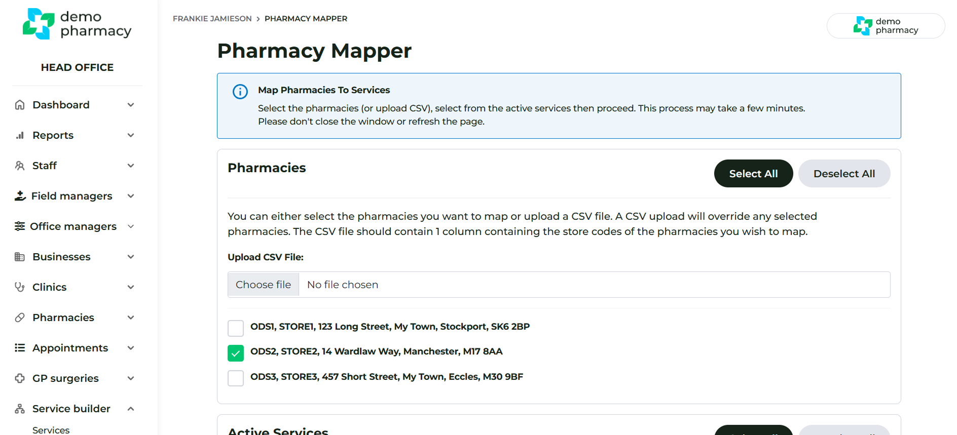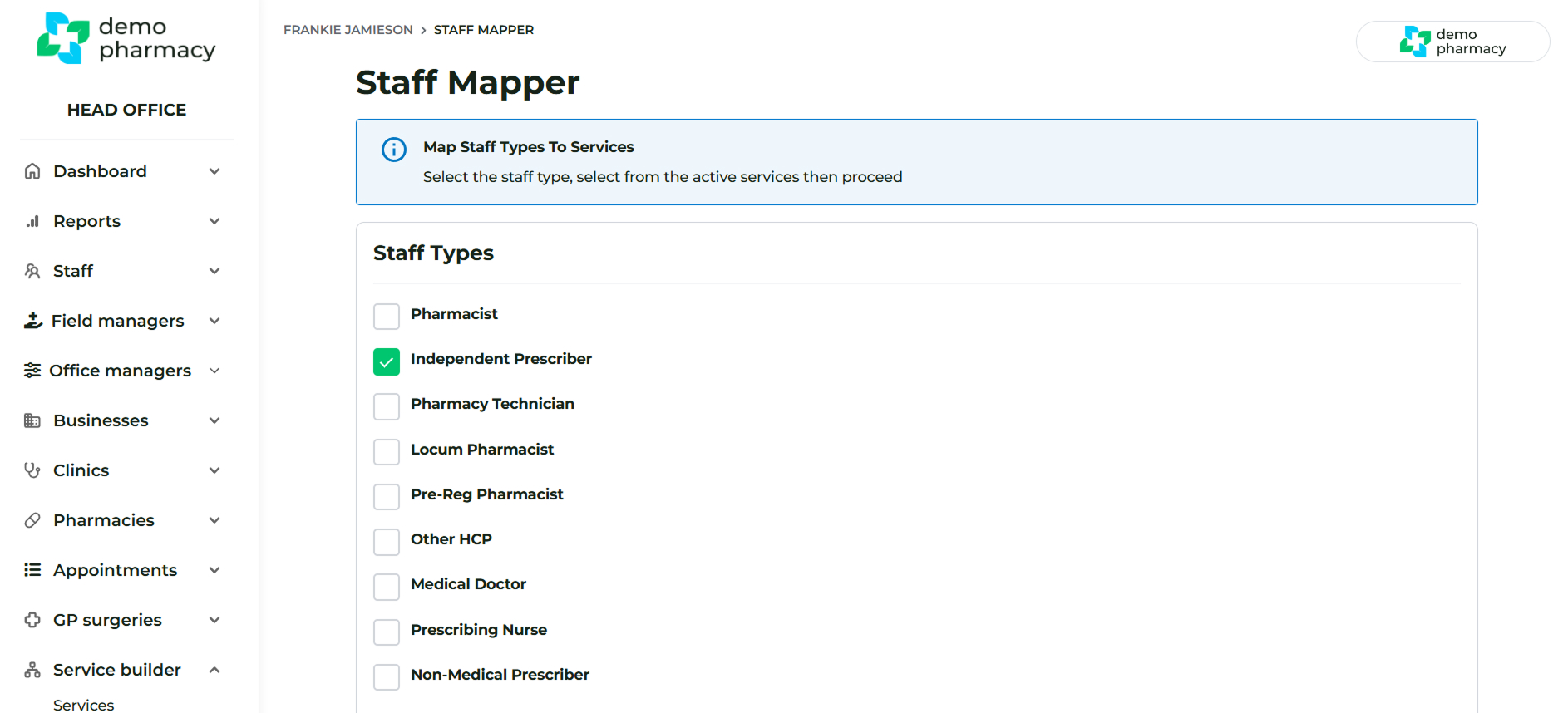 Mapping connects specific services to the pharmacies authorized to offer them and the staff authorized to administer them. This ensures compliance and controls access.