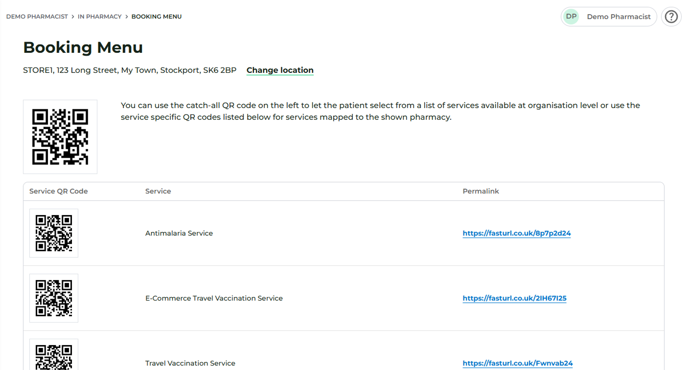 Every service you offer has a unique digital "front door." To find these, log in to a Pharmacist or Staff account and navigate to: In Pharmacy > Booking Menu