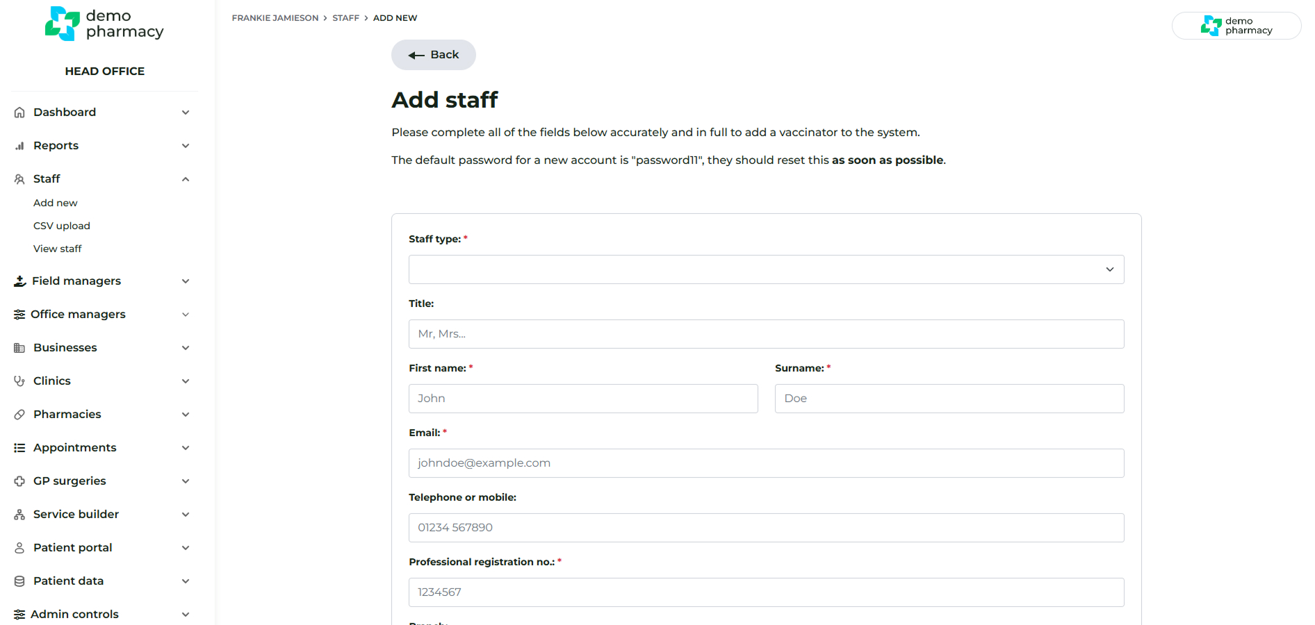 - To add a new staff account, go to 'Add New' and fill in the required personal details.