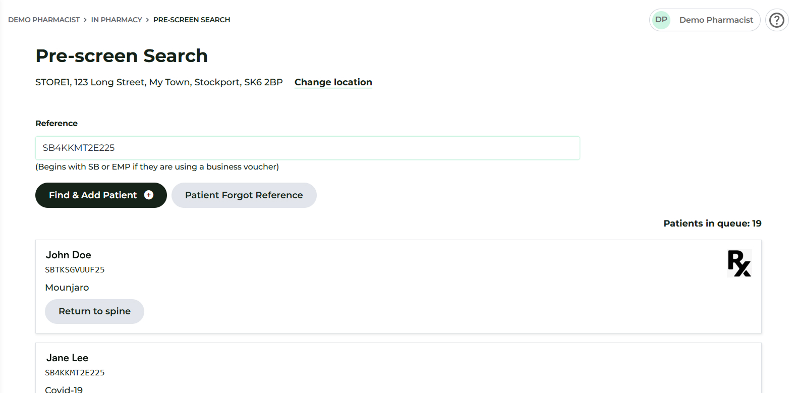If the patient has completed a pre-screen, they must provide their Reference Code. This code will start with one of two prefixes: