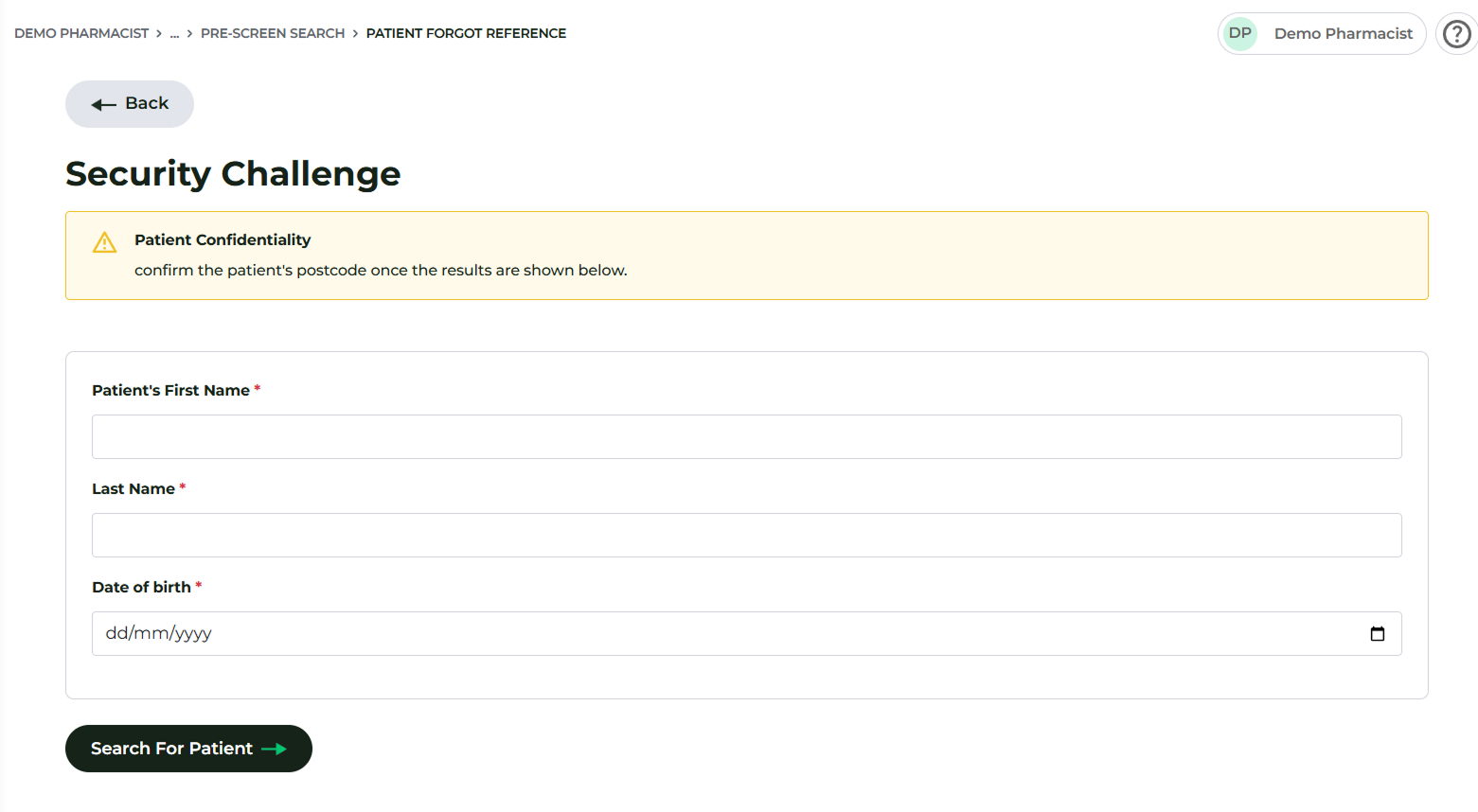 If a patient has forgotten their "SB..." or "EMP..." reference code, you can use the security challenge to retrieve it.