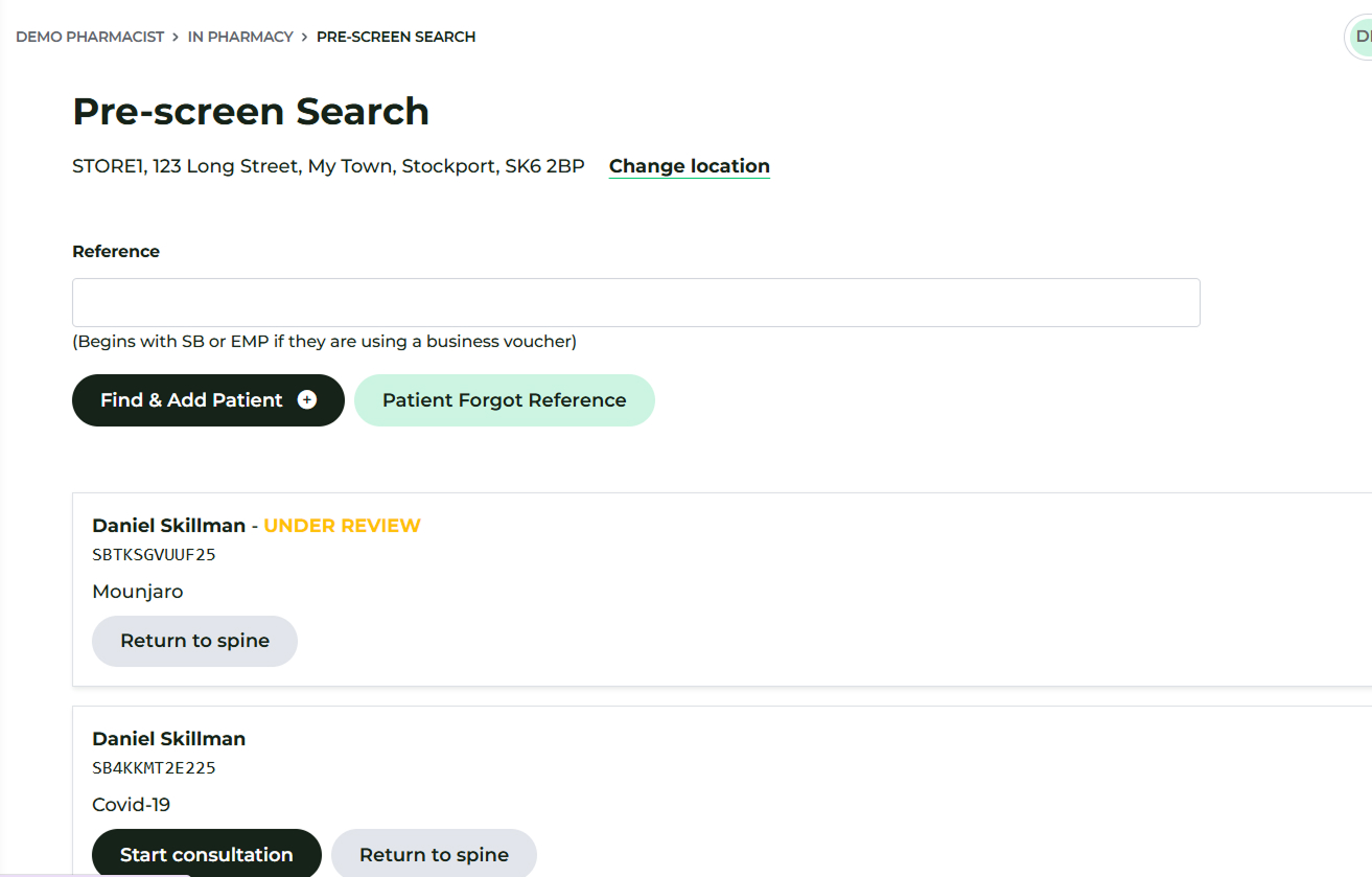 They will now appear in the list of patients on the Pre-screen Search page, where you can Start Consultation.