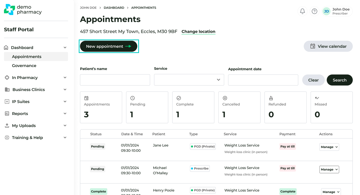 - Payment: For these manually booked appointments, payment must be processed locally at the pharmacy till.