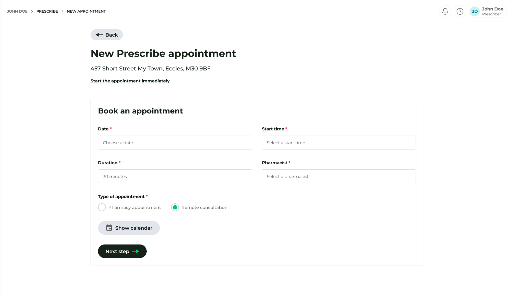 - Select the Pharmacist (the system will only display staff members configured as Prescribe pharmacists).