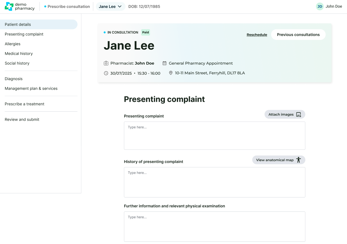 - Step-by-Step Navigation: The left-hand panel displays the stages of the consultation. You can click between these at will, allowing you to jump back to earlier sections if a patient remembers a key detail later in the conversation.