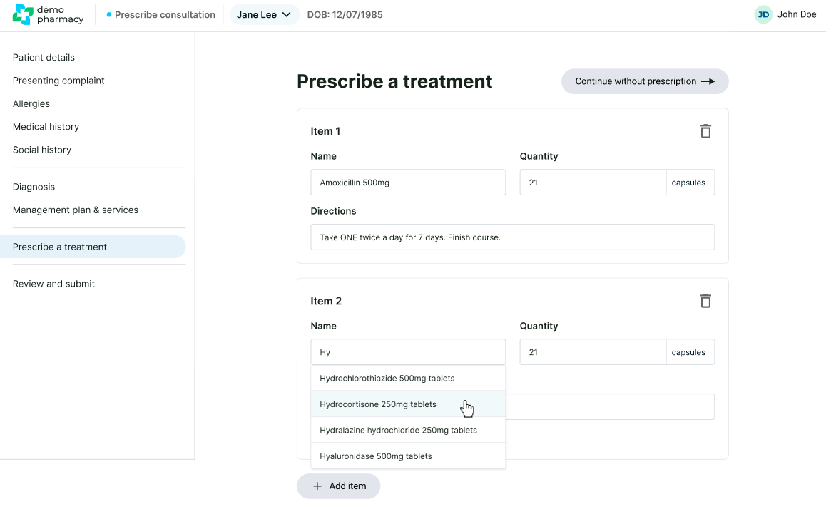 - Multiple Items: You have the flexibility to add multiple prescriptions to a single consultation if the patient’s condition requires a combination of treatments.