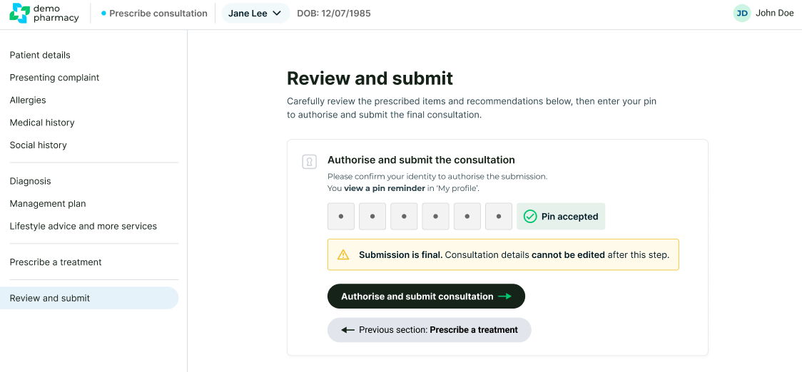 To legally sign off the consultation and issue the prescription, you must use your unique 6-digit Prescription Pin.