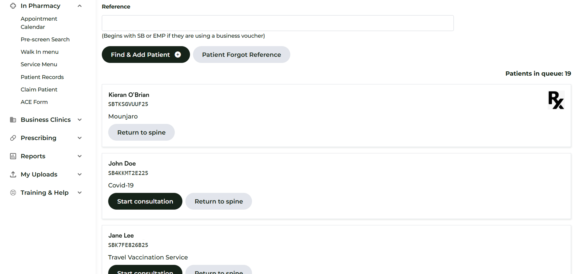 - From Pre-screen Search (Walk-ins): Go to In Pharmacy > Pre-screen Search, then click Start consultation for the specific patient record.