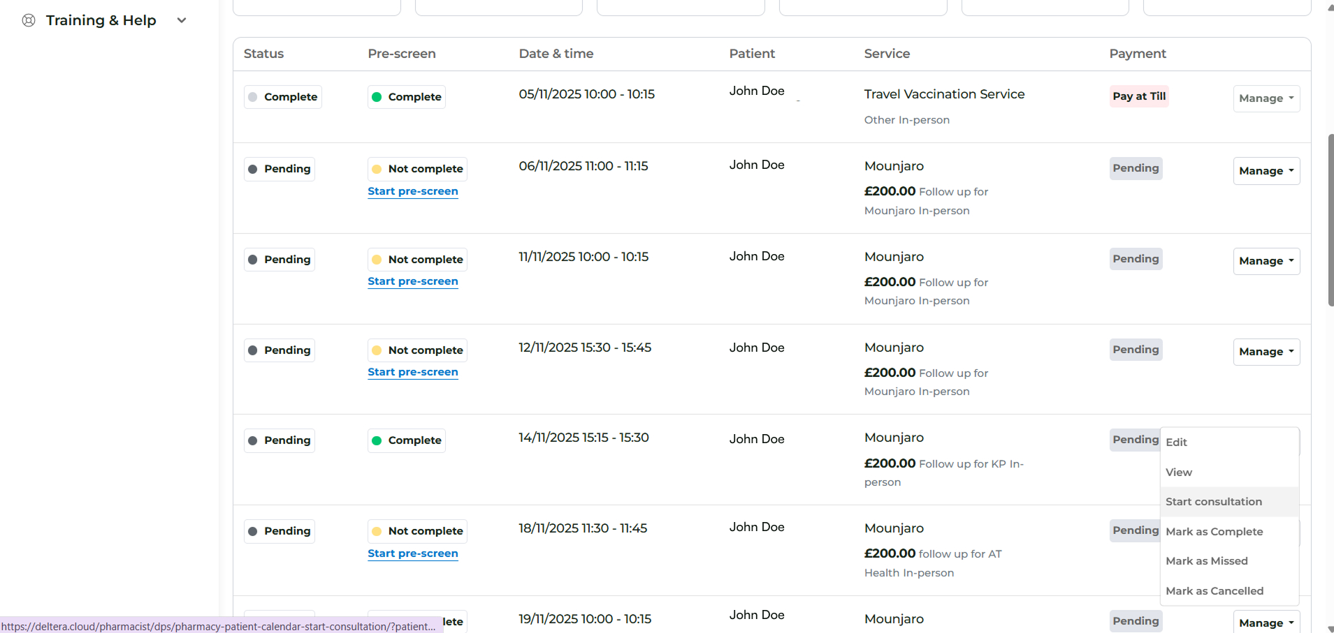 - From Deltera Appointments (Services Diary users): Go to Dashboard > Appointments > Manage, then select Start Consultation.
