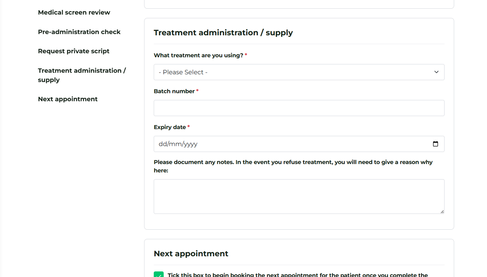 The treatment administration screen is organised into sections, guiding you through the necessary checks and actions.