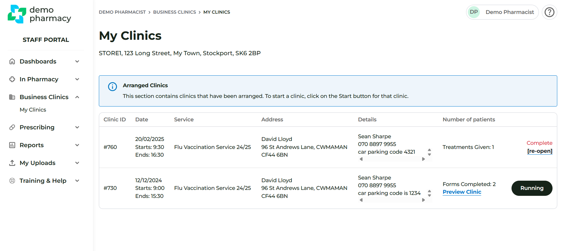 View your assigned clinics, preview patient details, and follow the required steps to start a clinic, including the mandatory Premise Audit.