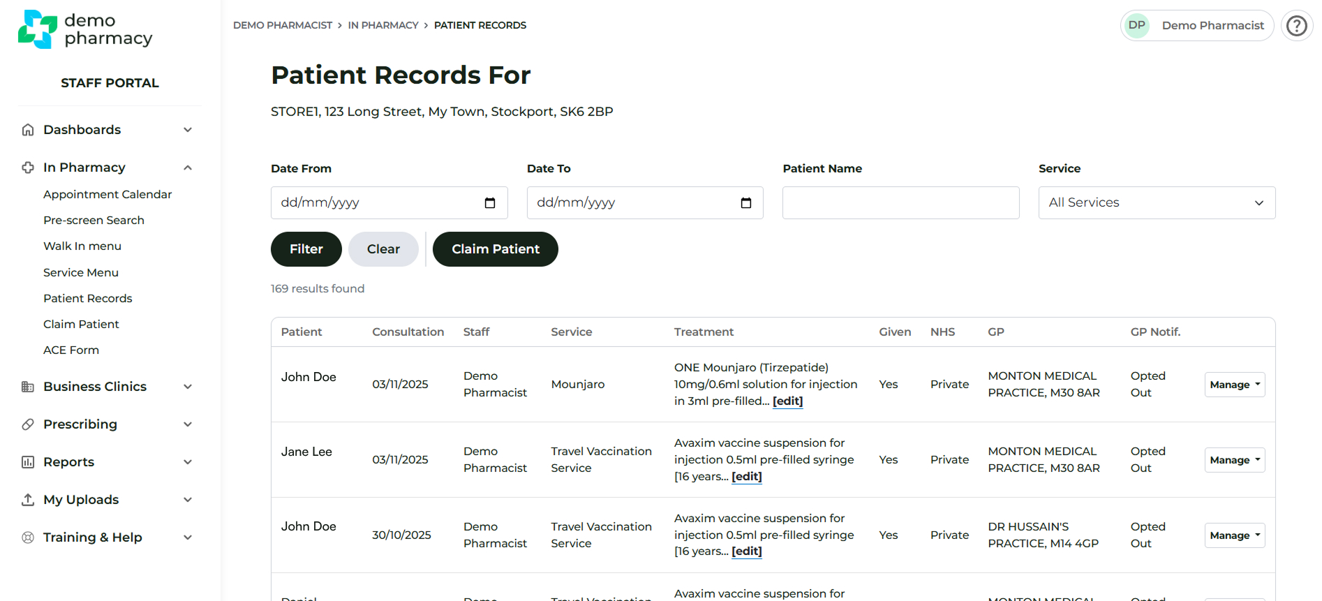 This shows Patient Hx as per your pharmacy - not the wider organisation. You can search for a specific patient using the filters at the top.