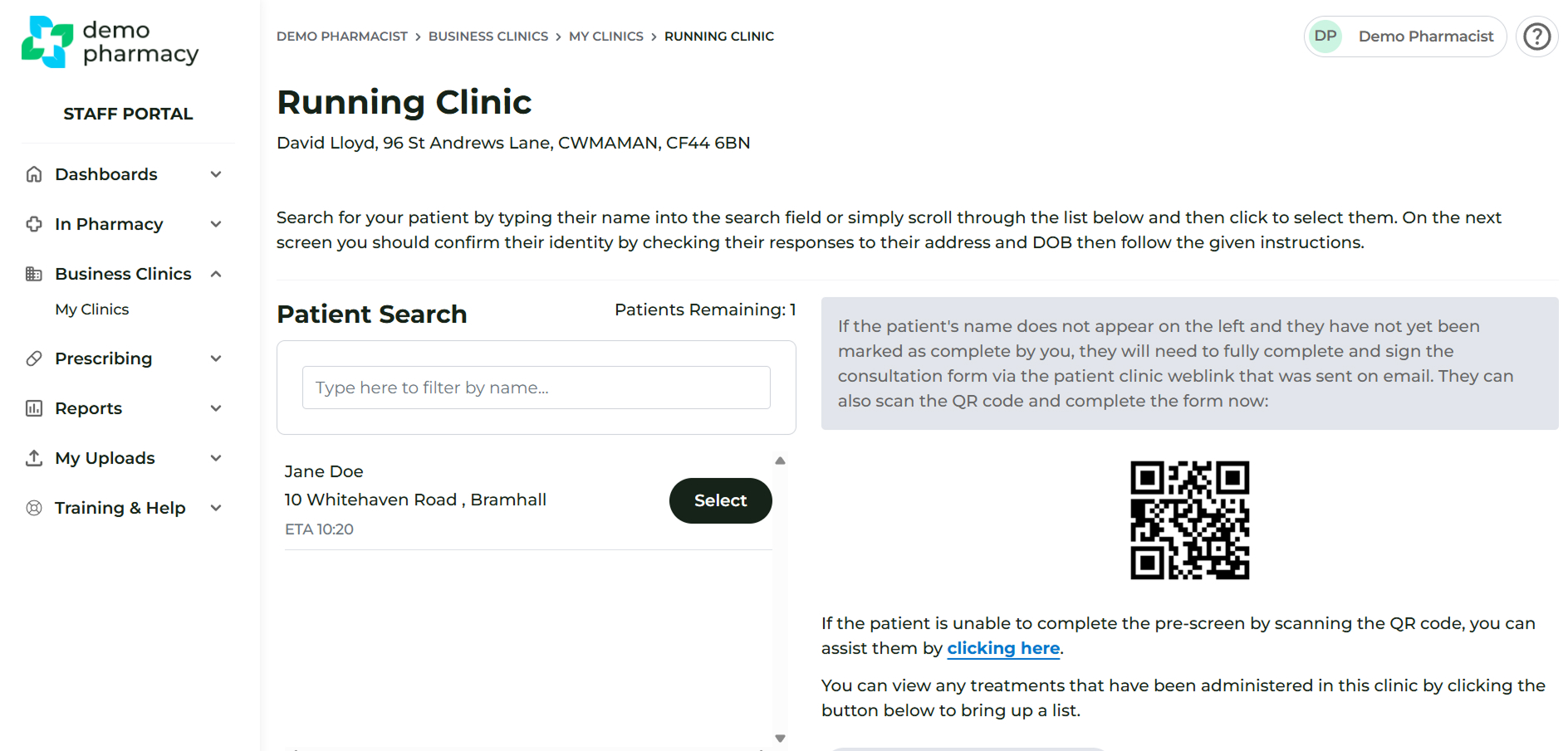 - Direct them to the QR code shown on the right side of the Clinic Running screen. They can use this code to access and complete the clinic pre-screen immediately.