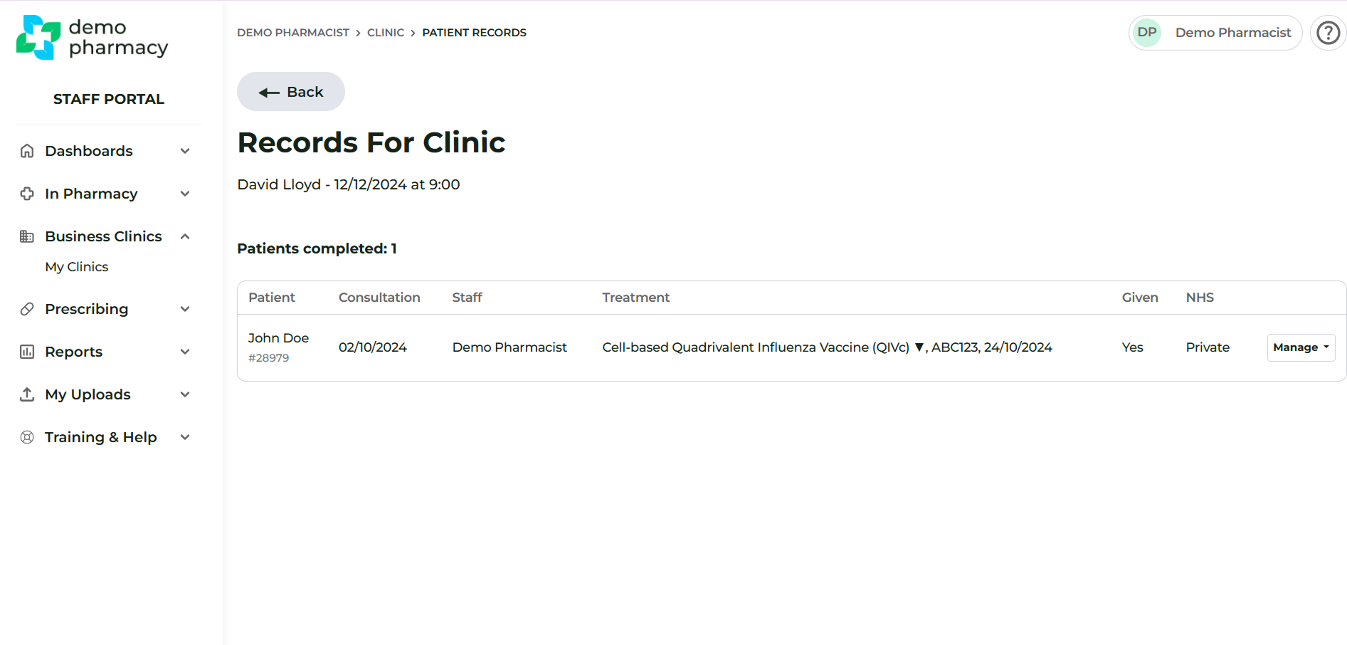You will be taken back to the clinic listing screen and shown a confirmation message that the clinic is complete. The status of the clinic will also change to Complete.
